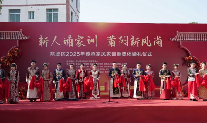 ?在融合古今特色的儀式上,新人們深情朗誦家訓(xùn),共飲合巹茶,讓這場(chǎng)簡(jiǎn)約婚禮成為了他們幸福生活的嶄新起點(diǎn)。?活動(dòng)現(xiàn)場(chǎng),伴隨著非物質(zhì)文化遺產(chǎn)節(jié)目“十音八樂”的展演,新人們身著紅色中式禮服緩緩登場(chǎng),誦庭訓(xùn)、行拜堂之禮、交換信物,感受著傳統(tǒng)禮儀與時(shí)代新風(fēng)相結(jié)合的獨(dú)特韻味。此外,現(xiàn)場(chǎng)還宣讀了“為愛減‘負(fù)’ 美‘荔’有你”——荔城區(qū)婚俗改革倡議書,倡議量力而行抵制高價(jià)彩禮,移風(fēng)易俗倡導(dǎo)簡(jiǎn)約婚禮?。
