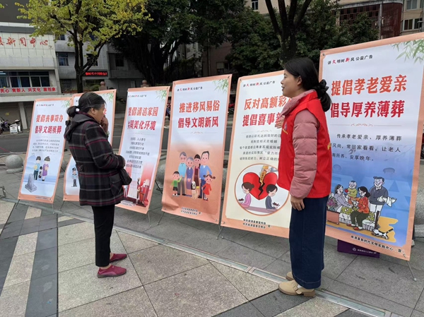 現(xiàn)場設(shè)置的移風易俗圖展區(qū),吸引群眾駐足觀看