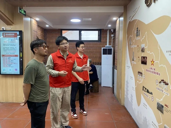 鯉城區(qū)新時(shí)代文明實(shí)踐中心和國(guó)網(wǎng)泉州供電公司聯(lián)合在西街新華路設(shè)置服務(wù)驛站,圖為國(guó)網(wǎng)志愿者為現(xiàn)場(chǎng)游客進(jìn)行旅游指引