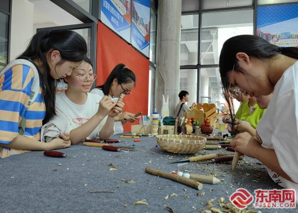 草編、黃氏木雕工藝、黃氏南少林鳴鶴拳、皂隸舞、文枕琴、竹雕、烙畫……當(dāng)天下午,國家級、省級非遺項目代表性傳承人受邀帶著各自的“絕技”走進(jìn)湄洲灣職業(yè)技術(shù)學(xué)院,在校園擺開展位。學(xué)生們圍聚在傳承人周圍,聆聽非遺項目背后的故事、了解其中制作工藝、動手參與體驗,在交流互動中感受非遺的獨特魅力。非遺代表性傳承人們展示了國家級非遺代表性項目的精湛技藝和精美作品,讓現(xiàn)場的師生嘆為觀止。