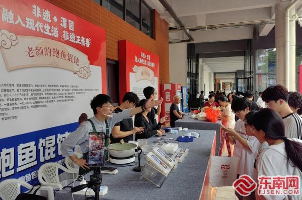 傍晚,文十番演奏、車鼓表演、舞獅表演輪番登場,非遺代表性傳承人共同為學(xué)院師生呈現(xiàn)一臺綜合性的文藝表演“大餐”。而在演出舞臺正對面,哆頭土筍凍、戴氏綠豆餅、新縣方糕、大洋林氏麥芽糖、豆?jié){炒各類非遺小吃吸引許多師生圍觀。特別是“老顏的鮑魚餛飩”攤位格外火爆,攤主是一個年輕小伙子,他一邊與學(xué)生交流,一邊現(xiàn)場直播,吸引許多大學(xué)生前來“打卡”,“融入現(xiàn)代生活——非遺正青春”在這個小攤位上具象化了。