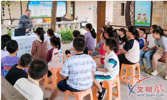 市級閩南童謠傳承人許成績在澳頭村史館外娓娓開講。翔安區(qū)委文明辦 供圖