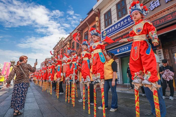 漳州市的主城區(qū)還有一個(gè)這幾年來非?;鸬姆沁z表演項(xiàng)目——踩高蹺。它是“云端綻放”的空中奇觀,可喜可賀可貴的是,踩高蹺的都是“少年郎”,有的還是兒童,才七八歲。幾年來,一旦有節(jié)假日,這些“高高在上”的孩子們帶出他們的絕活,傳承非遺。2024年的國慶,他們在古城的踩高蹺表演,直接拉滿游客的情緒。今年“五一”節(jié)日期間,市區(qū)林語堂故里文化旅游區(qū)的“蕉”個(gè)朋友嘉年華上,薌城區(qū)石亭鎮(zhèn)塘邊社區(qū)少兒高蹺隊(duì)33名“小哪吒”腳蹬長高蹺,紅綾翻飛間,腳下是鄉(xiāng)村振興的沃土,頭頂是文化傳承的蒼穹,成為蕉海中最靚麗的風(fēng)景線。節(jié)目還通過CCTV-4中文國際頻道直播連線現(xiàn)場,通過全球覆蓋的傳播渠道,展現(xiàn)閩南文化傳承,將這項(xiàng)“空中戲院”絕技推向國際視野。3米高的高蹺演員與30厘米高的傳統(tǒng)布袋木偶同臺(tái)對話,形成“頂天立地”與“掌上乾坤”的奇妙強(qiáng)烈反差。這種非遺之間的對話,讓市民游客更加直觀感受到閩南非遺的包容張力,也讓非遺傳承在時(shí)空中融合并有效發(fā)展。