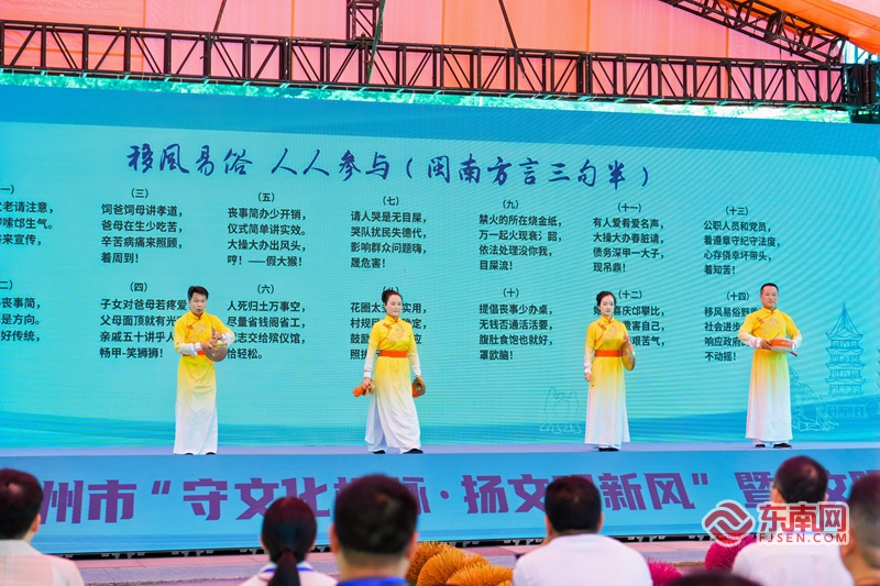 來(lái)自永春縣不同行業(yè)的四名文明實(shí)踐志愿者代表現(xiàn)場(chǎng)宣讀《文化遺產(chǎn)保護(hù)傳承文明實(shí)踐倡議書(shū)》,呼吁全社會(huì)共同守護(hù)文化遺產(chǎn)?;顒?dòng)現(xiàn)場(chǎng)還為福建省洛江監(jiān)獄等單位、永春文廟等4 個(gè)永春縣文化類文明實(shí)踐點(diǎn)授牌,并向泉州市保護(hù)文化遺產(chǎn)志愿服務(wù)隊(duì)和永春縣保護(hù)文化遺產(chǎn)志愿服務(wù)隊(duì)等文明實(shí)踐志愿服務(wù)隊(duì)授旗。在“文潤(rùn)萬(wàn)家”文藝匯演中,閩南方言三句半《移風(fēng)易俗人人參與》、提線木偶《小沙彌下山》等節(jié)目輪番上演,以鄉(xiāng)音鄉(xiāng)韻講述泉州故事,用傳統(tǒng)藝術(shù)展現(xiàn)文明新風(fēng),成為“守文化根脈·揚(yáng)文明新風(fēng)”的生動(dòng)實(shí)踐。