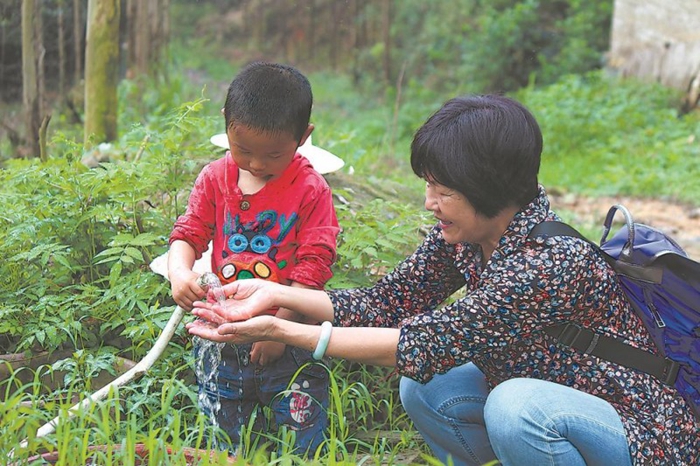 2016年4月27日,漳州市長(zhǎng)泰區(qū)鼓鳴山,三歲的“小羊倌”小洪在徐智心的陪同下趕羊下山,并幫她沖水洗手。小洪自幼幫著殘疾父母在山林里放羊,經(jīng)過(guò)徐智心多年的走訪幫扶,如今與她相處如親人。陳少偉 攝