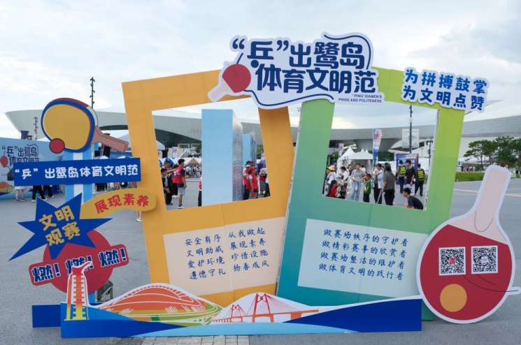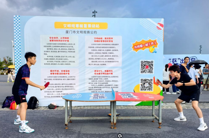 活動(dòng)現(xiàn)場(chǎng),主辦方巧妙將《廈門(mén)市文明觀賽公約》融入互動(dòng)體驗(yàn)中,設(shè)計(jì)了“彈入文明觀賽杯”“為熱愛(ài)一起乒”等趣味環(huán)節(jié),將“垃圾隨手清理”“適時(shí)喝彩”等觀賽禮儀自然融入游戲互動(dòng),讓市民在歡樂(lè)氛圍中領(lǐng)悟文明觀賽精髓。融合閩南紅墻元素與乒乓主題的特色打卡墻,也成為觀眾爭(zhēng)相合影的熱門(mén)景點(diǎn)。