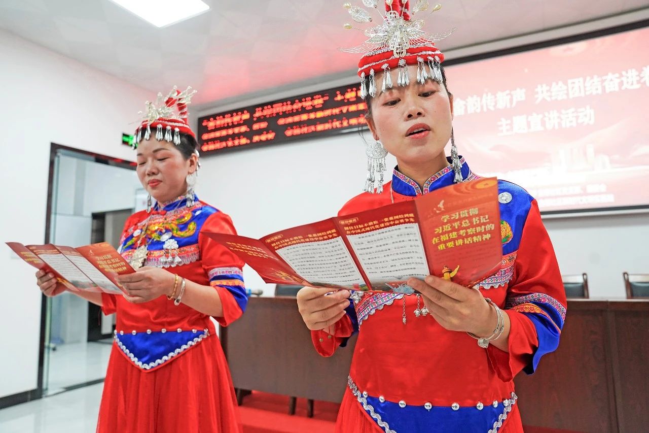 此次系列宣講活動(dòng),依托金涵畬族鄉(xiāng)精心培育的“山哈哥”與“金鳳凰”兩支特色理論宣講隊(duì)伍展開。宣講員們多為熟悉畬族語言文化的本地骨干,既有村主干、非遺傳承人,也有返鄉(xiāng)創(chuàng)業(yè)青年。他們巧妙地將學(xué)習(xí)貫徹習(xí)近平總書記在福建考察時(shí)的重要講話精神,轉(zhuǎn)化為通俗易懂的畬語講解,并融入新編畬歌的悠揚(yáng)旋律之中。在金溪社區(qū)、金榕社區(qū)的黨群服務(wù)中心、金涵村的慈善廣場,宣講現(xiàn)場總是圍滿了聞聲而來的鄉(xiāng)民群眾。身著畬族服裝的宣講員們,用鄉(xiāng)親們倍感親切的鄉(xiāng)音,唱成了田間地頭聽得懂、記得住的山哈新調(diào)。