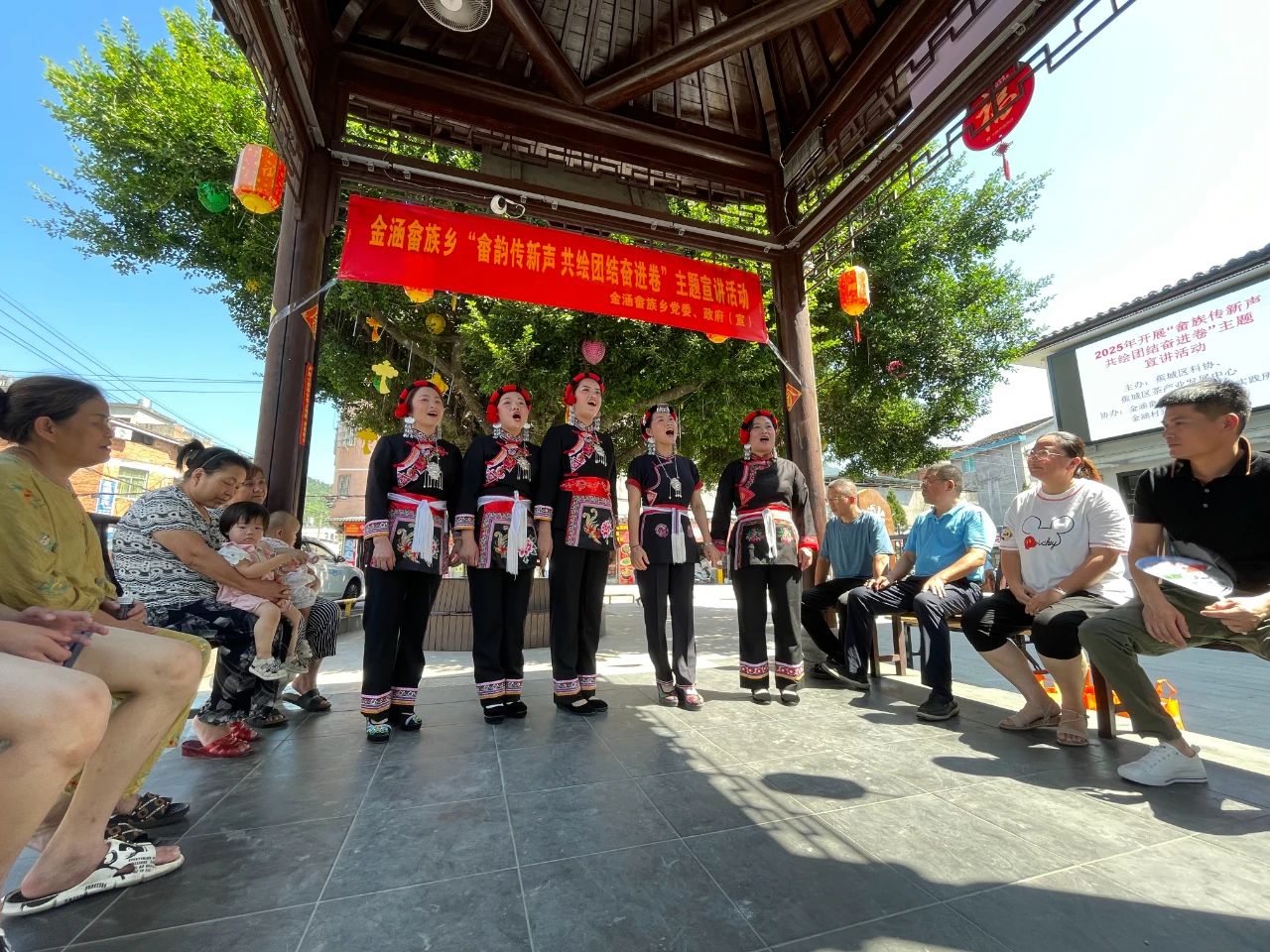 “阿妹哎,聽我唱段新畬歌,黨的二十大精神記心窩;像石榴籽一樣緊緊抱在一起,鄉(xiāng)村振興路越走越寬闊……”近日,金涵畬族鄉(xiāng)金涵村慈善廣場上,身著傳統(tǒng)鳳凰紋畬服的“金鳳凰”宣講隊(duì)成員雷碧玉一亮嗓,清亮的畬歌便裹著夏風(fēng)飄向人群。連日來,由金涵畬族鄉(xiāng)主辦的“畬韻傳新聲 共繪團(tuán)結(jié)奮進(jìn)卷”主題宣講活動(dòng),在金溪社區(qū)、金榕社區(qū)、金涵村相繼拉開帷幕,用帶著鄉(xiāng)土溫度的畬語畬歌,將黨的創(chuàng)新理論送到群眾心坎上。