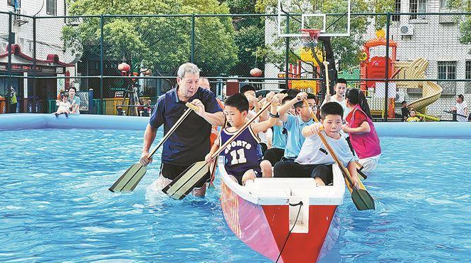 孩子們參加龍舟文化夏令營(yíng),體驗(yàn)劃龍舟的樂趣。