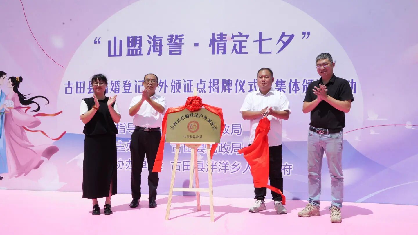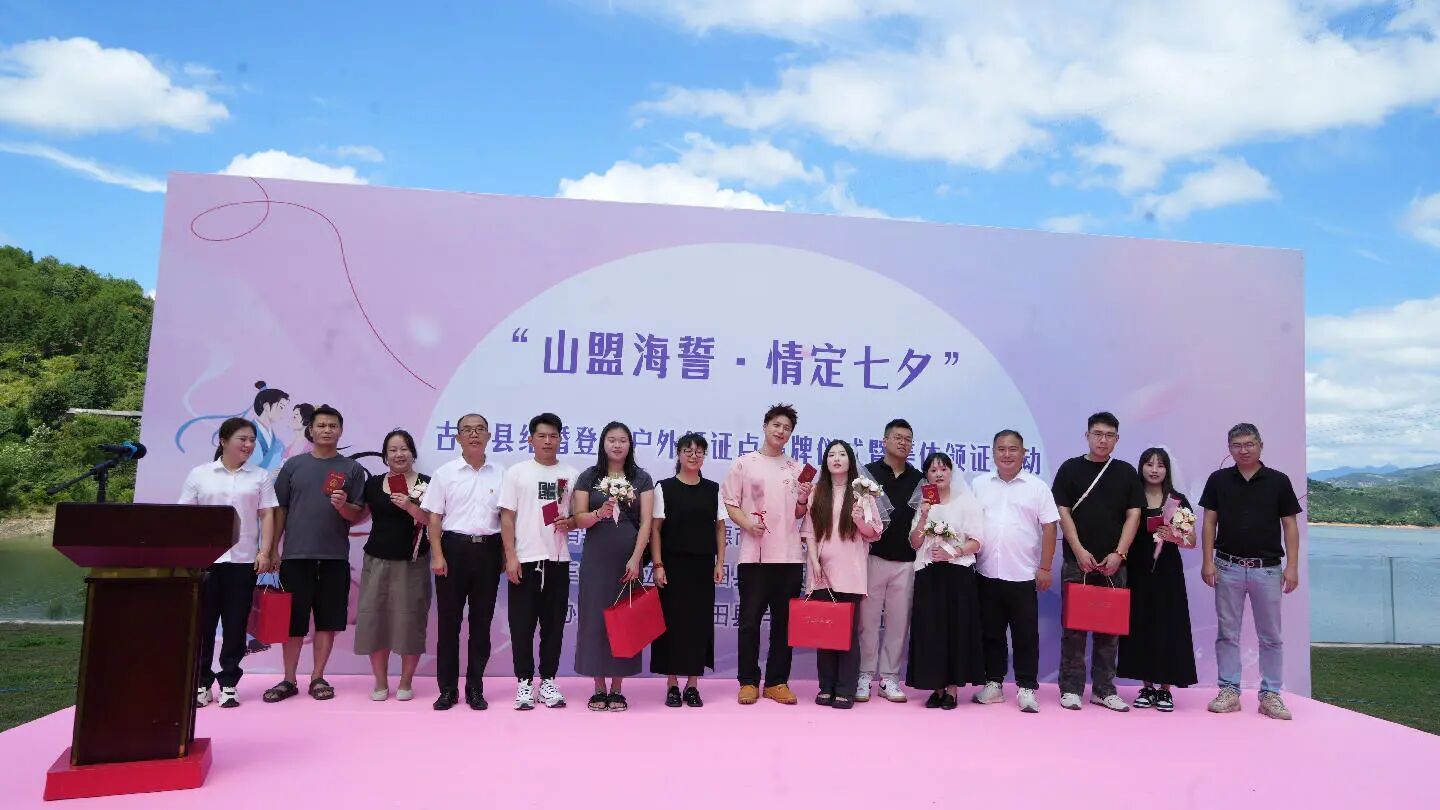 8月29日,“山盟海誓·情定七夕”古田縣結(jié)婚登記戶外頒證點揭牌儀式暨七夕集體頒證活動,在泮洋鄉(xiāng)新華村湖畔溫情啟幕。5對準新人以山水為媒、天地為證,在浪漫氛圍中完成頒證,開啟人生新旅程。