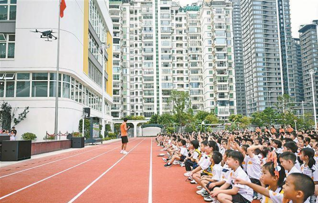 廈外附小湖濱校區(qū)在開學(xué)典禮上展示警用無人機(jī)。
