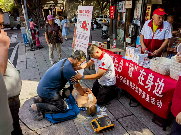 文明風(fēng)9月10日訊 “按壓深度要達到5-6厘米,頻率保持每分鐘100-120次,這樣才能有效幫助心臟恢復(fù)跳動。”9月9日,三坊七巷南口人頭攢動,醫(yī)護志愿者手把手指導(dǎo)居民練習(xí)心肺復(fù)蘇,一場主題為“急救普及惠鄰里 文明實踐護安康”的“急救地攤”文明實踐活動在此熱鬧開展,將實用急救知識送到居民“家門口”。