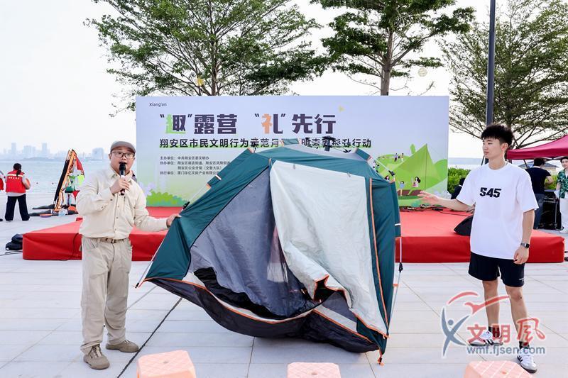 文明露營專項行動針對露營中常見的垃圾亂扔、植被破壞等問題在百年古渡荻花洲開展,活動通過樂隊演唱《翔安志愿者之歌》等點燃氛圍,部門代表宣讀《文明露營倡議書》,倡導“明禮福建人”的生態(tài)環(huán)保理念;戶外探險教練現場講解安全露營要點、演示帳篷搭建技巧,并用“露營垃圾如何處理”“明火使用規(guī)范”等知識問答,引導市民樹立“無痕露營”意識,以實際行動踐行文明。