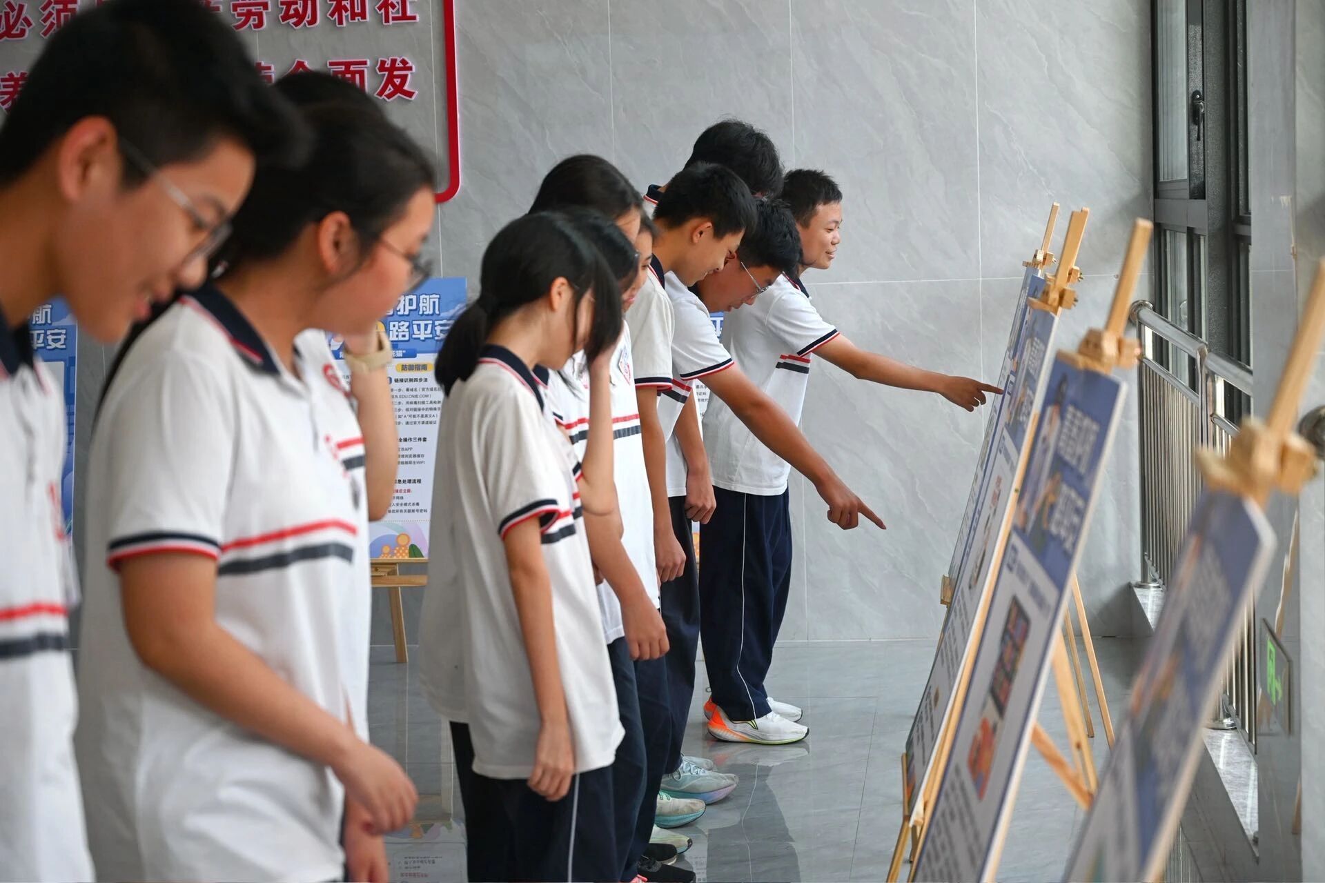 展板內(nèi)容的設(shè)計(jì)上圖文并茂,運(yùn)用漫畫、警示標(biāo)語和信息圖表等多種視覺元素,生動(dòng)直觀。同學(xué)們認(rèn)真聆聽講解、仔細(xì)閱讀內(nèi)容,不時(shí)駐足討論,學(xué)習(xí)氛圍濃厚。