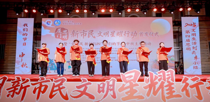 9月26日,廈門·思明新市民“文明星耀行動(dòng)”首發(fā)儀式暨“我們的節(jié)日·中秋”主場(chǎng)活動(dòng)在思明區(qū)黃厝大隊(duì)部廣場(chǎng)舉行?;顒?dòng)以文明為紐帶,邀請(qǐng)新市民與本地居民共慶佳節(jié),并發(fā)布新市民文明星耀行動(dòng)?;顒?dòng)由廈門市委文明辦、市委社會(huì)工作部、市人社局、市住建局、市總工會(huì)、團(tuán)市委、市婦聯(lián)指導(dǎo),思明區(qū)主辦,在新浪微博、云現(xiàn)場(chǎng)、愛奇藝、B站等平臺(tái)同步直播,吸引超千萬人次關(guān)注。