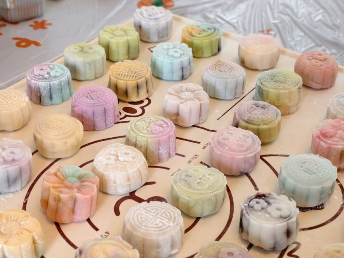 活動現(xiàn)場,志愿者拿出提前準(zhǔn)備好制作冰皮月餅所需的預(yù)拌粉、餡料、熟糕粉、模具、包裝盒等各種材料,并細(xì)心地向大家講解制作冰皮月餅的步驟和技巧。聽完講解,大家迫不及待地戴上手套開始動手做冰皮月餅。小小冰皮月餅不僅包裹著甜蜜的餡料也凝聚著勞動的喜悅,更承載著團(tuán)圓美滿的美好寓意,大家在指尖的忙碌與香甜的氣息中,提前感受著中秋佳節(jié)的溫暖與團(tuán)圓。制作完成后,大家圍坐在一起品嘗自己制作的月餅,聊聊中秋節(jié)相關(guān)文化與趣事,現(xiàn)場一片歡聲笑語,臉上洋溢著滿足的笑容。