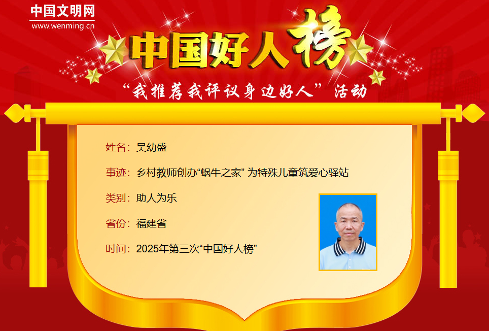 吳幼盛,男,1971年6月生,福建省漳州市詔安縣白石小學(xué)高級(jí)教師,公益組織“詔安縣蝸牛之家”創(chuàng)建人。吳幼盛是一名鄉(xiāng)村教師,也是一位唐氏綜合征患兒的父親,他聯(lián)合其他6名特殊兒童家長(zhǎng)共同創(chuàng)辦了公益組織“詔安縣蝸牛之家”,致力于為縣域內(nèi)的特殊兒童及其家庭提供專業(yè)支持、情感關(guān)懷和社會(huì)融入平臺(tái)。2022年,在詔安縣委文明辦的牽頭下,“蝸牛之家”加入詔安縣民政局登記注冊(cè)的詔安縣愛(ài)心義工協(xié)會(huì),成為其15隊(duì)。創(chuàng)辦“蝸牛之家”以來(lái),吳幼盛傾注大量心血,將其打造成特殊兒童成長(zhǎng)的溫暖驛站、130余個(gè)特殊家庭互助的愛(ài)心港灣。