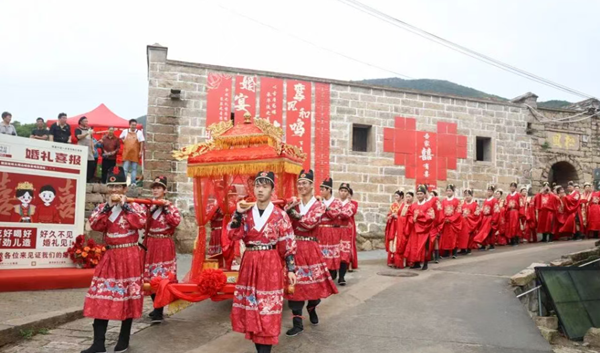 活動(dòng)在充滿傳統(tǒng)韻味的“花轎巡游”中拉開(kāi)序幕。新人身著鳳冠霞帔、繡龍喜褂,沿著古村古道緩步巡游,形成一道流動(dòng)的民俗風(fēng)景線。