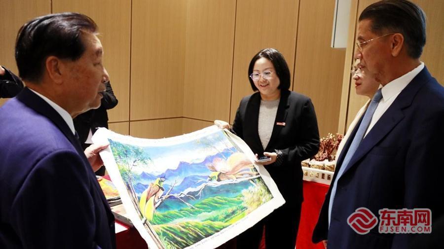 林占熺向謝西蒙展示巴新人民送他的“天堂鳥”畫作。