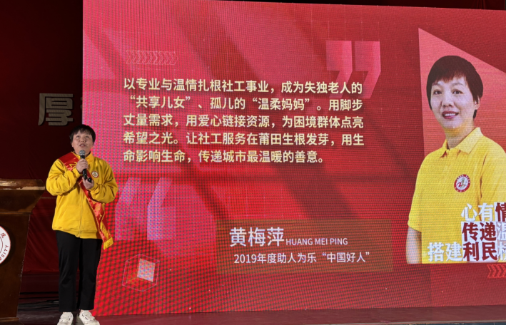 2019年度助人為樂“中國好人”黃梅萍,作為涵江區(qū)助涵社會工作服務(wù)中心理事長,長期運(yùn)用專業(yè)社會工作方法服務(wù)弱勢群體,用實(shí)際行動詮釋了“贈人玫瑰,手留余香”的奉獻(xiàn)精神。
