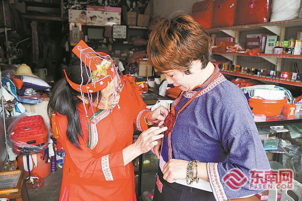 走進青水民俗街的刺繡服飾展示館,映入眼簾的是各式各樣的畬族特色服飾,男士的靛藍衣擺繡著金邊紋路,女士的朱紅長裙綴著銀色流蘇。展示臺上,一系列畬繡文創(chuàng)產(chǎn)品令人眼前一亮,有鑰匙扣、扇子、香袋、枕頭、背包……這些生活用品上都繡著或印著畬繡的特色紋樣。