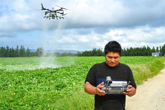 種植戶陳成華操控農(nóng)業(yè)無人機(jī)對300畝平潭濱海鹽堿沙地示范田噴灑水肥。江信恒 攝