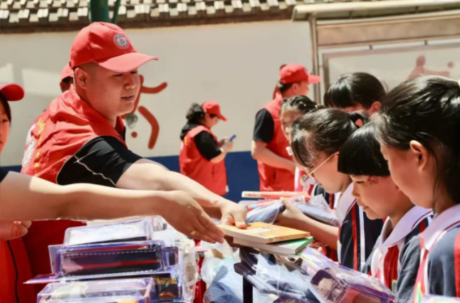 陸浩給孩子們發(fā)放書本。受訪者供圖