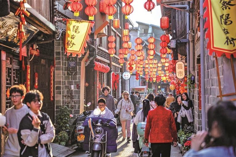 保護(hù)性修繕后的察陽古街熱鬧非凡。李郁 攝