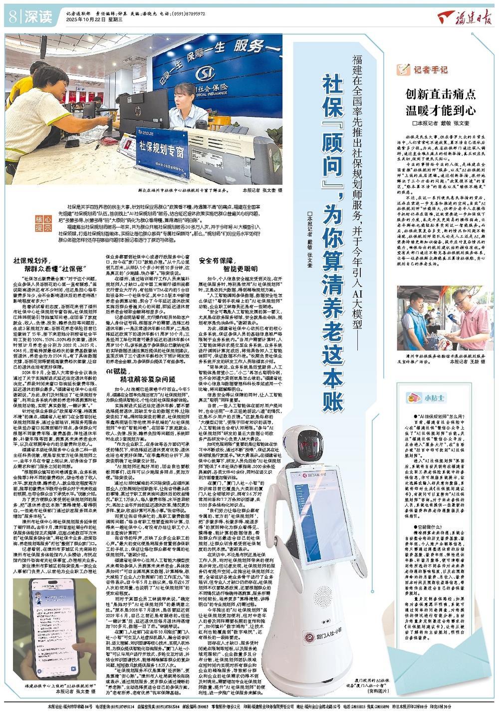 2025年10月22日《福建日?qǐng)?bào)》第08版 核心提示 社保是關(guān)乎百姓養(yǎng)老的民生大事,針對(duì)社保業(yè)務(wù)群眾“政策看不懂、待遇算不清”的痛點(diǎn),福建在全國(guó)率先組建“社保規(guī)劃師”隊(duì)伍,首創(chuàng)線上“AI社保規(guī)劃師”服務(wù),結(jié)合延遲退休政策實(shí)施后群眾普遍關(guān)心的問(wèn)題,把“多繳多得、長(zhǎng)繳多得”的“大原則”轉(zhuǎn)化為群眾看得懂、算得清的“明白賬”。 福建推出社保規(guī)劃師服務(wù)一年來(lái),共為群眾開(kāi)展社保規(guī)劃服務(wù)30多萬(wàn)人次,并于今年將AI大模型引入社保領(lǐng)域,打造社保規(guī)劃智能體,實(shí)現(xiàn)讓每位群眾都有“專屬社保顧問(wèn)”。那么,“規(guī)劃師”們的業(yè)務(wù)水平如何?群眾體驗(yàn)怎樣?還存在哪些問(wèn)題?本報(bào)記者進(jìn)行了探訪與體驗(yàn)。 社保規(guī)劃師,幫群眾看懂“社保賬” “社保怎么繳費(fèi)最合算?”對(duì)于這個(gè)問(wèn)題,企業(yè)參保人員湯麗花的心里一直有疑惑,“雖說(shuō)距離退休還有不少時(shí)間,但還是擔(dān)心每年繳費(fèi)多與少,會(huì)不會(huì)影響退休后的養(yǎng)老待遇?影響程度有多大?” 抱著試試看的態(tài)度,湯麗花來(lái)到了福州市社保中心社保規(guī)劃專窗咨詢。社保規(guī)劃師江瑋瑋現(xiàn)場(chǎng)引導(dǎo)她填寫(xiě)問(wèn)卷,在回答了家庭就業(yè)、收入、負(fù)債、投資、贍養(yǎng)負(fù)擔(dān)等問(wèn)題后,生成3套規(guī)劃方案:湯麗花養(yǎng)老保險(xiǎn)目前已經(jīng)繳納了15年,接下來(lái)若她分別按省社會(huì)平均工資的100%、150%、200%檔次續(xù)繳,退休時(shí)預(yù)計(jì)月養(yǎng)老金分別為3002元、3625元、4248元,若維持原最低檔次的繳費(fèi)基數(shù)繳納到退休,養(yǎng)老金約為2504元。有了具體數(shù)據(jù)支撐,湯麗花覺(jué)得要提高繳費(fèi)檔次續(xù)繳,讓自己的退休生活有更好保障。 2024年9月,全國(guó)人大常委會(huì)會(huì)議表決通過(guò)了關(guān)于實(shí)施漸進(jìn)式延遲法定退休年齡的決定?!澳嵌螘r(shí)間來(lái)窗口咨詢延長(zhǎng)繳費(fèi)年限、延遲退休的群眾最多?!备=ㄊ∩绫V行闹魅沃x穎說(shuō),“為此,我們及時(shí)推出了‘社保規(guī)劃專窗’,利用業(yè)務(wù)系統(tǒng)內(nèi)嵌的養(yǎng)老待遇測(cè)算和社保規(guī)劃功能,實(shí)現(xiàn)‘真實(shí)數(shù)據(jù),一鍵計(jì)算’?!?/p>