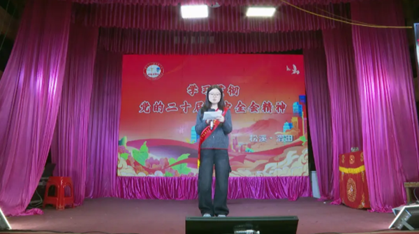 福小宣“五福講習(xí)班”講習(xí)員圍繞全會精神宣講。松溪縣融媒體中心 供圖 在渭田鎮(zhèn)項溪村文化大禮堂,福小宣“五福講習(xí)班”講習(xí)員圍繞全會精神,將理論宣講與鄉(xiāng)土藝術(shù)深度融合。他們運用充滿“泥土味”的快板趣語和有獎問答等互動形式,巧妙解讀全會核心要義,并緊密結(jié)合項溪村橋茶非遺傳承等生動實踐,將“扎實做好非物質(zhì)文化遺產(chǎn)的系統(tǒng)性保護”這一重要論述轉(zhuǎn)化為群眾聽得懂、能領(lǐng)會的身邊道理。
