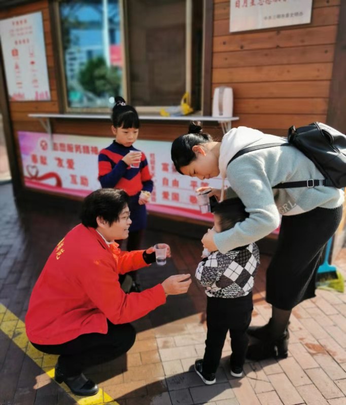 2019年12月21日,邱菊珍在三明萬達(dá)“日月星”驛站志愿服務(wù)值班,為路過的市民送上熱水 福建省志愿者協(xié)會(huì)供圖