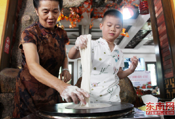 一位小朋友正在嘗試薄餅皮的制作,吳招治在一旁教授。 東南網(wǎng)記者 顏財(cái)斌 攝