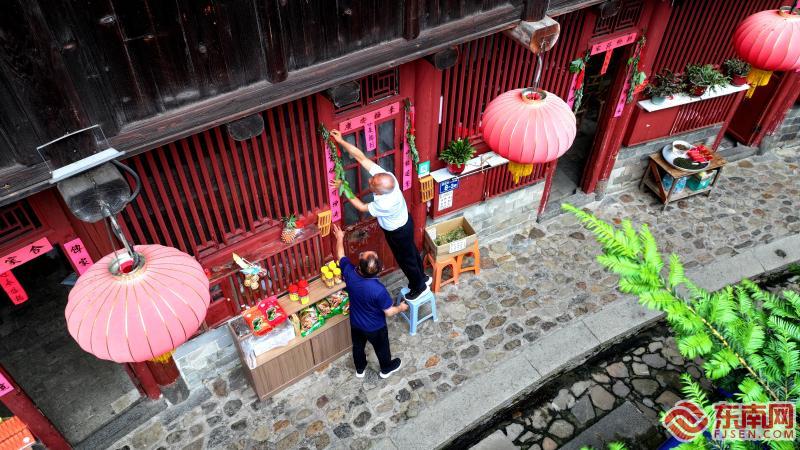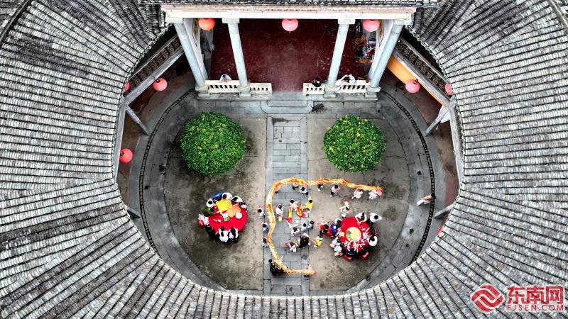 端午前夕,福建省龍巖市永定區(qū)洪坑土樓景區(qū)的“土樓王子”振成樓大院,當(dāng)?shù)卮迕裾鱿惆?、做艾葉粄、舞龍燈。 永定區(qū)融媒體供圖