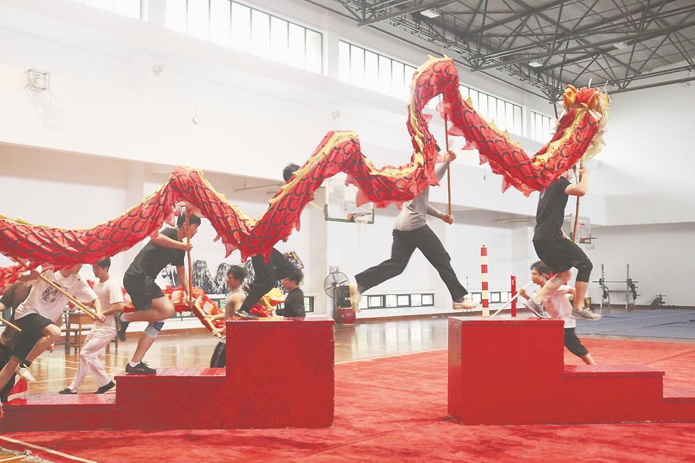 集美大學(xué)體育館內(nèi),舞龍隊隊員訓(xùn)練揮汗如雨。