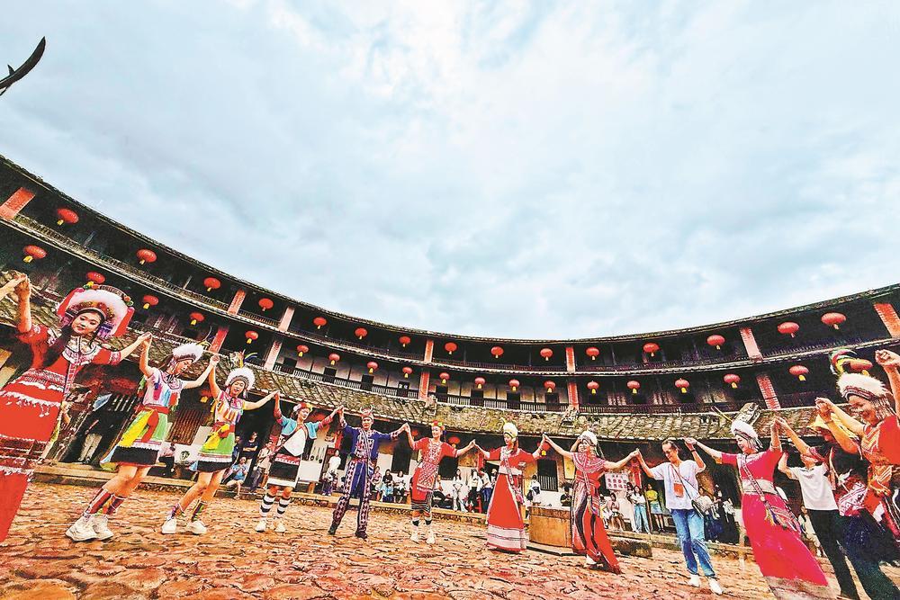 在華安縣的二宜樓里,游客跳起拉手舞。 游斐淵 攝