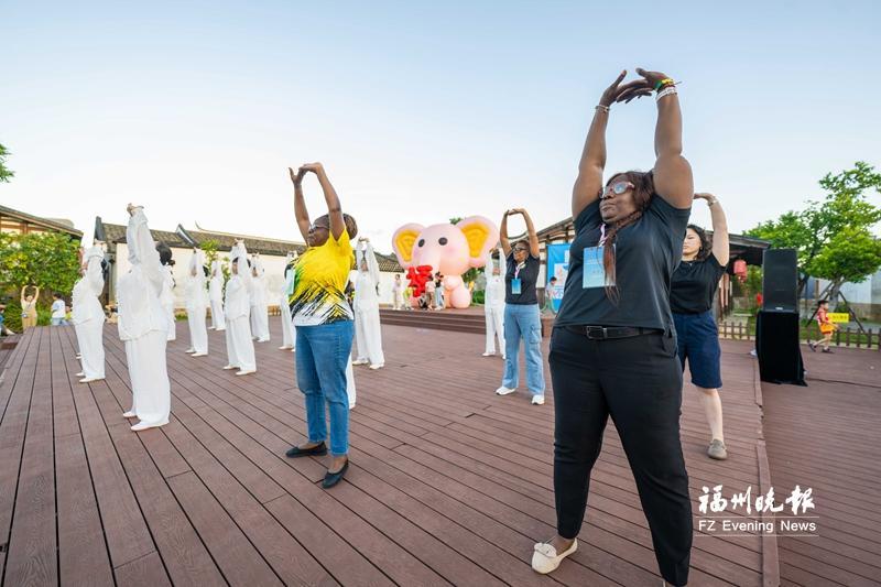 隨后,專業(yè)老師帶領(lǐng)大家練八段錦、戶外瑜伽,一招一式、一呼一吸間,浮躁與疲憊悄然消散。不少在街區(qū)游玩的外國友人被吸引,加入練習八段錦的隊伍,體驗后直呼“暢快”。