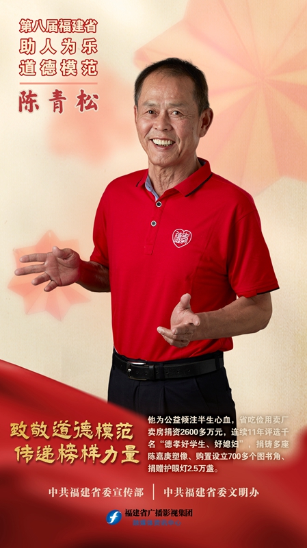 陳青松,1956年9月出生,廈門市翔安區(qū)德孝教育促進會會長。他為公益傾注半生心血,省吃儉用賣廠賣房捐資慈善2600多萬元,自掏腰包連續(xù)11年評選獎勵千名“德孝好學(xué)生”、千名“德孝好媳婦”,向多所學(xué)校捐鑄陳嘉庚塑像、購置設(shè)立700多個圖書角、捐贈護眼燈2.5萬盞等。[詳細(xì)]